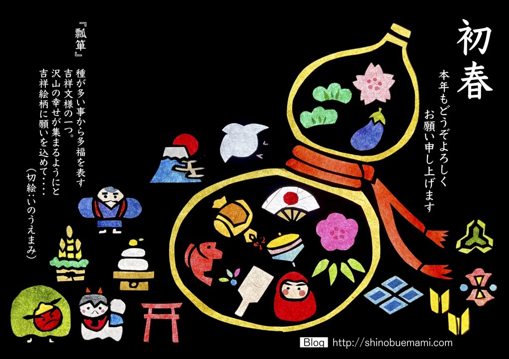 皆様におかれましても、沢山の幸に包まれますようにとの願いをこめて、今年は吉祥絵柄を切絵にしてみましたよ。
